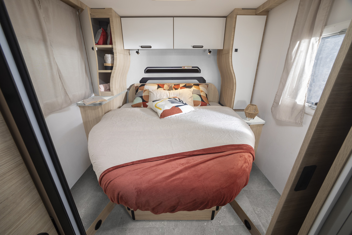 Met een centraal bed hebt u een kamer zoals thuis. Dankzij de centrale positie kunnen aan weerszijden kastjes worden geplaatst, waardoor extra bergruimte wordt gecreëerd. U kunt er bijvoorbeeld kledij en beddengoed in kwijt, zonder rommel te creëren in de rest van de camper. Dankzij de centrale positie is er aan weerzijden ook ruimte voor een nachttafel.